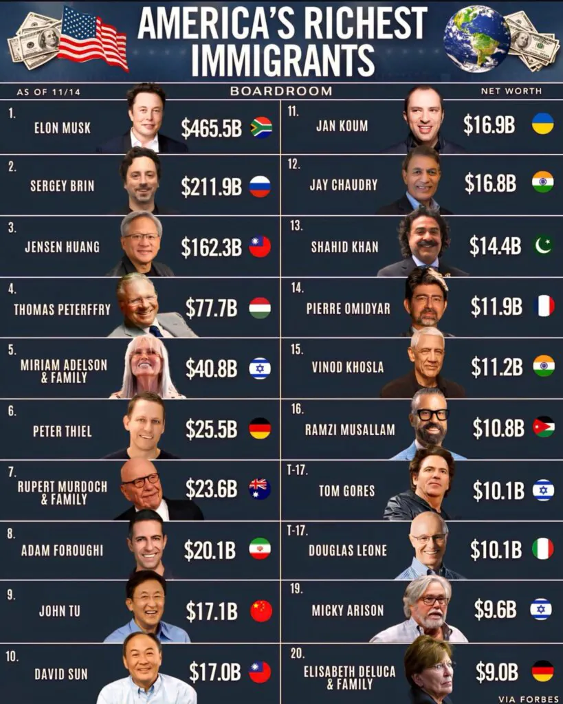 This ranking challenges the idea that immigration weakens an economy. These individuals did not just create wealth for themselves. They built companies, created jobs, and shaped entire industries.